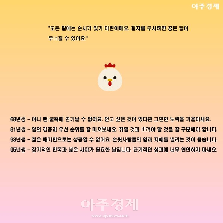 ▶닭띠 오늘의 운세 "모든 일에는 순서가 있기 마련이에요. 절차를 무시하면 공든 탑이 무너질 수 있어요."