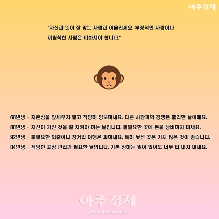 ▶원숭이띠 오늘의 운세 "자신과 뜻이 잘 맞는 사람과 어울리세요. 부정적인 사람이나 꺼림칙한 사람은 피하셔야 합니다."