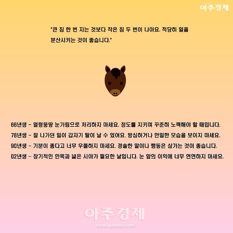 ▶말띠 오늘의 운세 "큰 짐 한 번 지는 것보다 작은 짐 두 번이 나아요. 적당히 일을 분산시키는 것이 좋습니다."