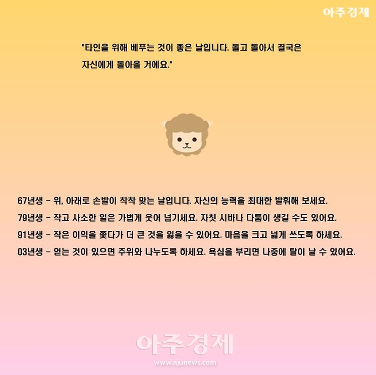 ▶양띠 오늘의 운세 "타인을 위해 베푸는 것이 좋은 날입니다. 돌고 돌아서 결국은 자신에게 돌아올 거에요."