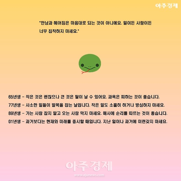 ▶뱀띠 오늘의 운세 "만남과 헤어짐은 마음대로 되는 것이 아니에요. 일이든 사람이든 너무 집착하지 마세요."