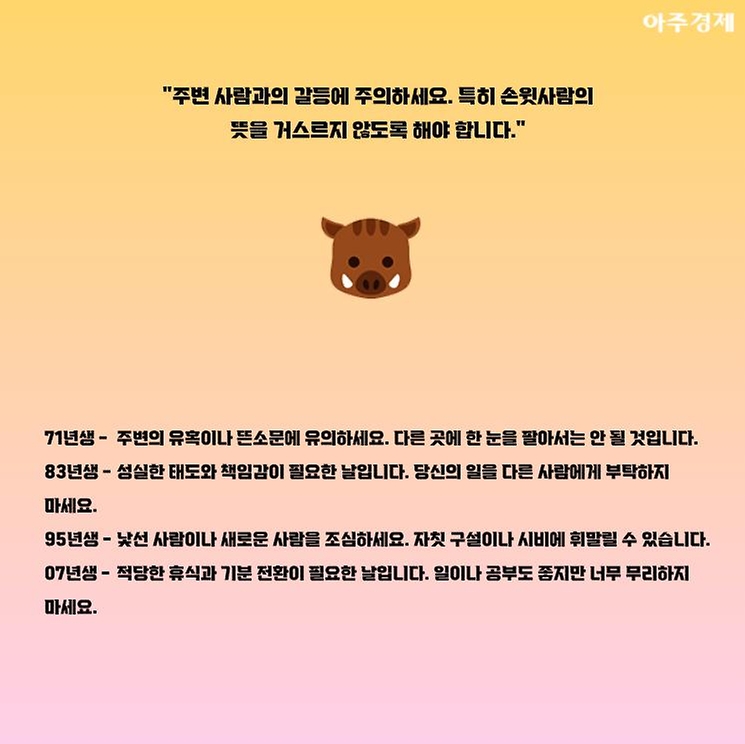 ▶돼지띠 오늘의 운세 "주변 사람과의 갈등에 주의하세요. 특히 손윗사람의 뜻을 거스르지 않도록 해야 합니다."
