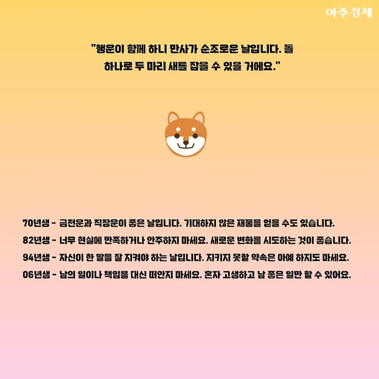 ▶개띠 오늘의 운세 "행운이 함께 하니 만사가 순조로운 날입니다. 돌 하나로 두 마리 새를 잡을 수 있을 거에요."