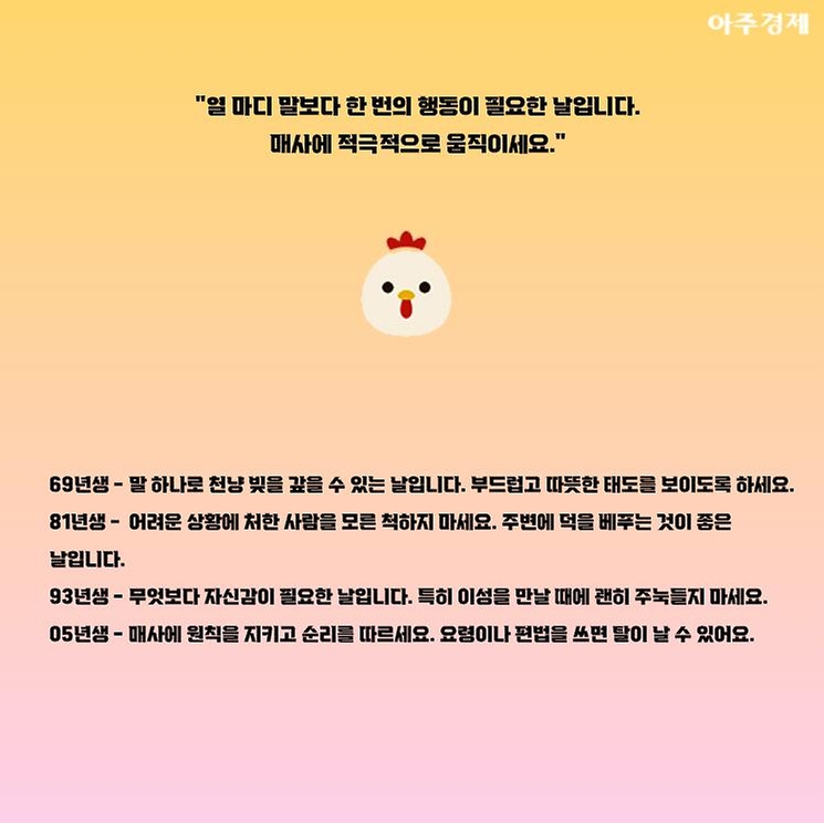 ▶닭띠 오늘의 운세 "열 마디 말보다 한 번의 행동이 필요한 날입니다. 매사에 적극적으로 움직이세요."