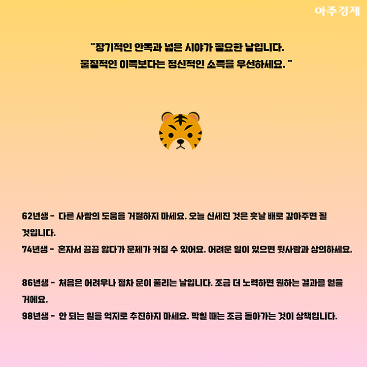 ▶호랑이띠 오늘의 운세 "장기적인 안목과 넓은 시야가 필요한 날입니다. 물질적인 이득보다는 정신적인 소득을 우선하세요. "