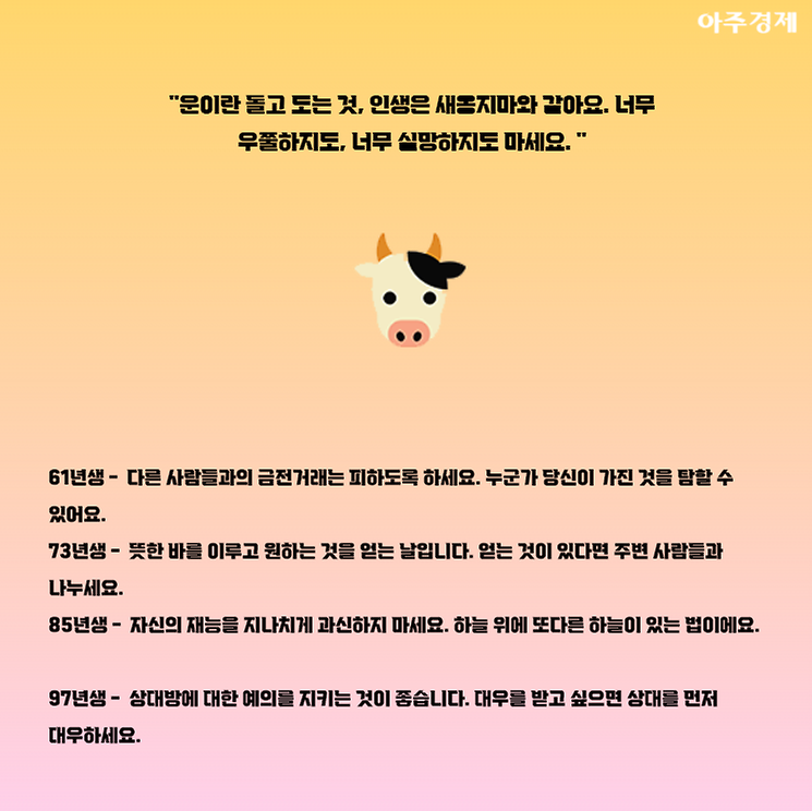 ▶소띠 오늘의 운세 "운이란 돌고 도는 것, 인생은 새옹지마와 같아요. 너무 우쭐하지도, 너무 실망하지도 마세요. "