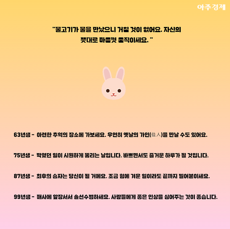 ▶토끼띠 오늘의 운세 "물고기가 물을 만났으니 거칠 것이 없어요. 자신의 뜻대로 마음껏 움직이세요. "
