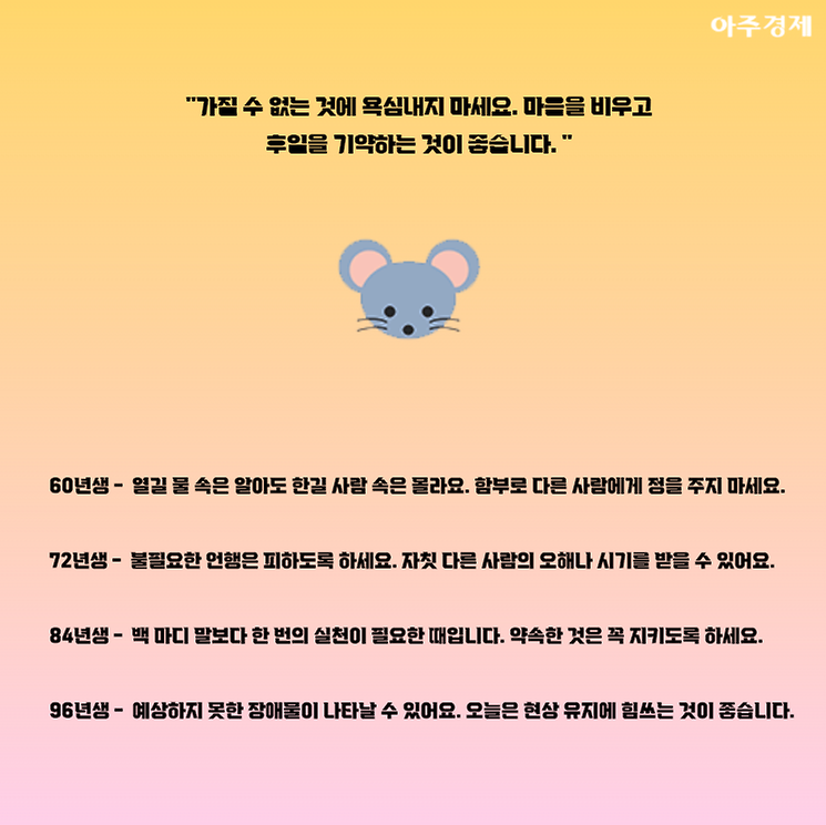 ▶쥐띠 오늘의 운세 "가질 수 없는 것에 욕심내지 마세요. 마음을 비우고 후일을 기약하는 것이 좋습니다. "