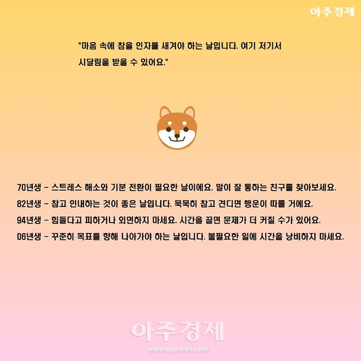 ▶개띠 오늘의 운세 "마음 속에 참을 인자를 새겨야 하는 날입니다. 여기 저기서 시달림을 받을 수 있어요."