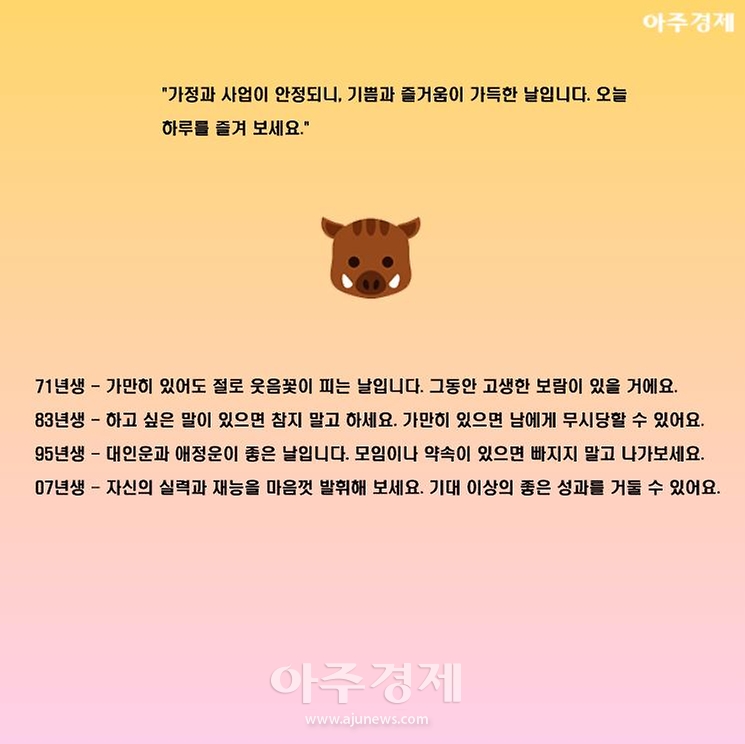 ▶돼지띠 오늘의 운세 "가정과 사업이 안정되니, 기쁨과 즐거움이 가득한 날입니다. 오늘 하루를 즐겨 보세요."