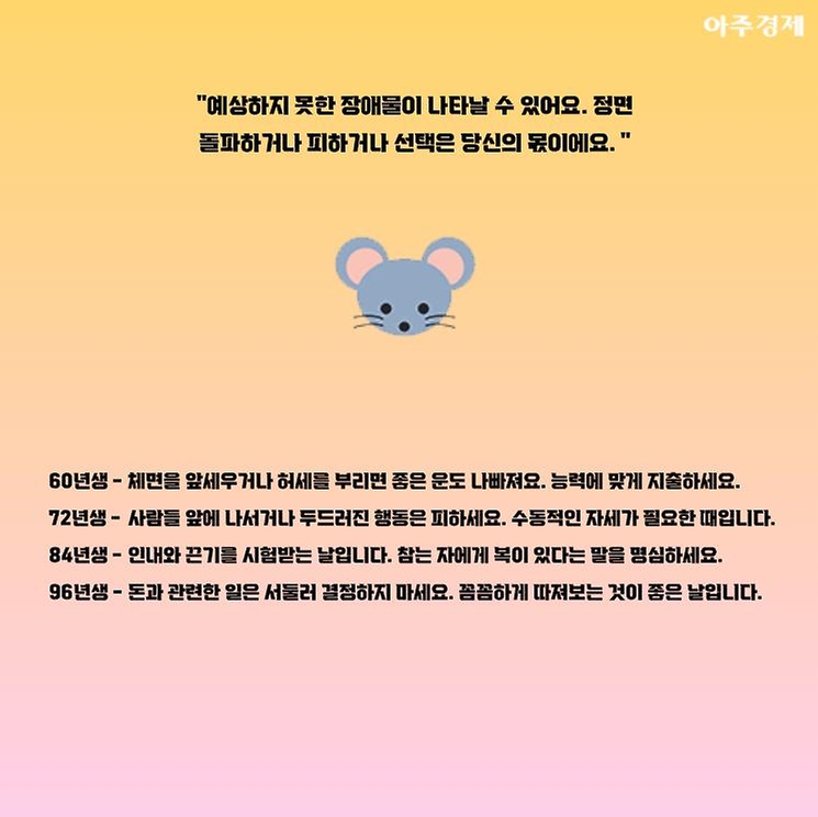 ▶쥐띠 오늘의 운세 "예상하지 못한 장애물이 나타날 수 있어요. 정면 돌파하거나 피하거나 선택은 당신의 몫이에요. "