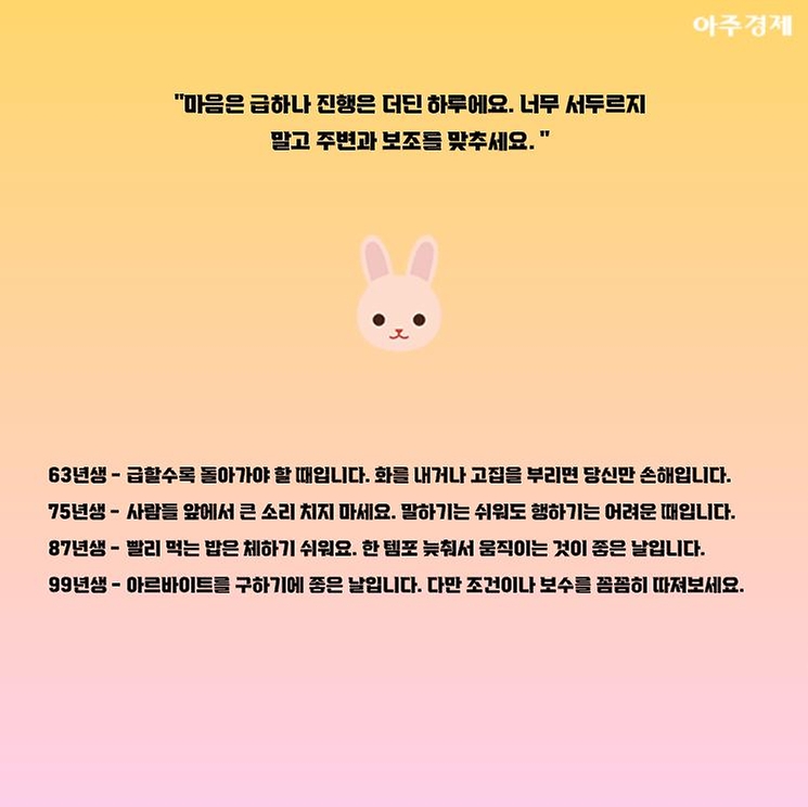 ▶토끼띠 오늘의 운세 "마음은 급하나 진행은 더딘 하루에요. 너무 서두르지 말고 주변과 보조를 맞추세요. "