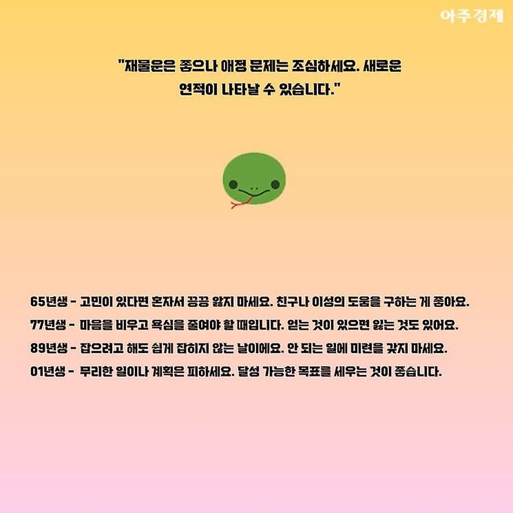 ▶뱀띠 오늘의 운세  "재물운은 좋으나 애정 문제는 조심하세요. 새로운 연적이 나타날 수 있습니다."
