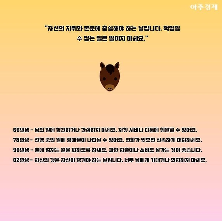 ▶말띠 오늘의 운세 "자신의 지위와 본분에 충실해야 하는 날입니다. 책임질 수 없는 일은 벌이지 마세요."