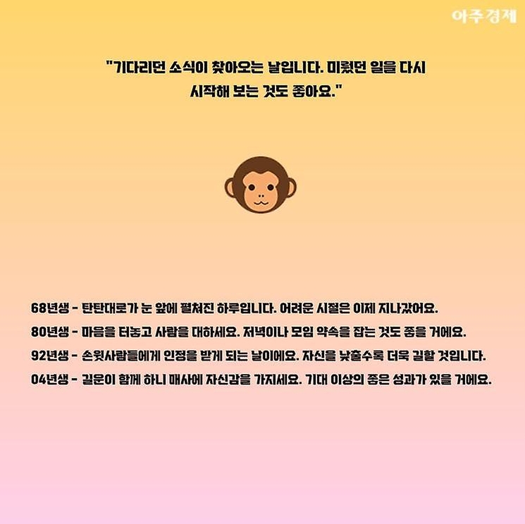 ▶원숭이띠 오늘의 운세 "기다리던 소식이 찾아오는 날입니다. 미뤘던 일을 다시 시작해 보는 것도 좋아요."