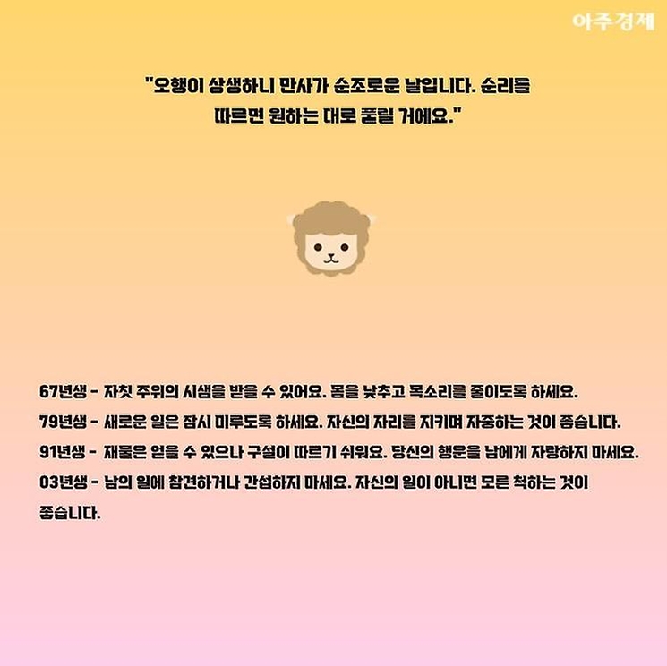 ▶양띠 오늘의 운세 "오행이 상생하니 만사가 순조로운 날입니다. 순리를 따르면 원하는 대로 풀릴 거에요."