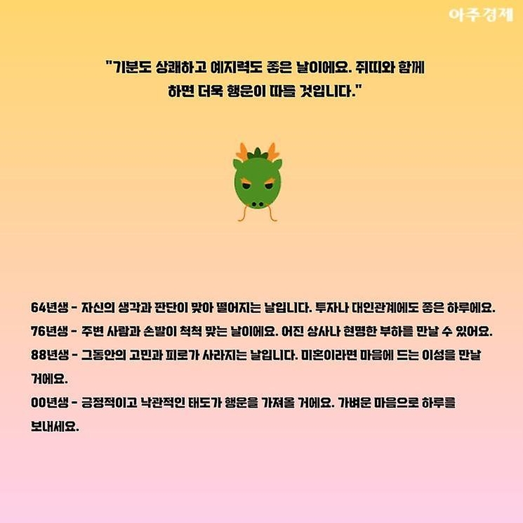 ▶용띠 오늘의 운세 "기분도 상쾌하고 예지력도 좋은 날이에요. 쥐띠와 함께 하면 더욱 행운이 따를 것입니다."