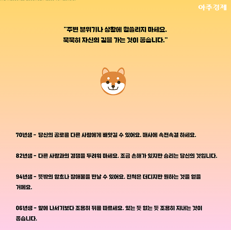 ▶개띠 오늘의 운세 "주변 분위기나 상황에 휩쓸리지 마세요. 묵묵히 자신의 길을 가는 것이 좋습니다."