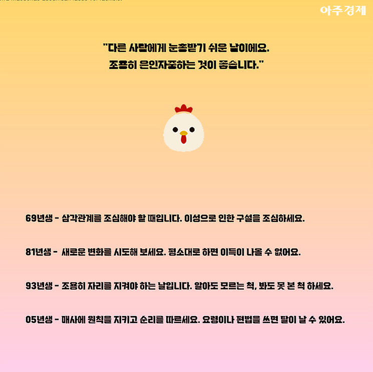 ▶닭띠 오늘의 운세 "다른 사람에게 눈총받기 쉬운 날이에요. 조용히 은인자중하는 것이 좋습니다."