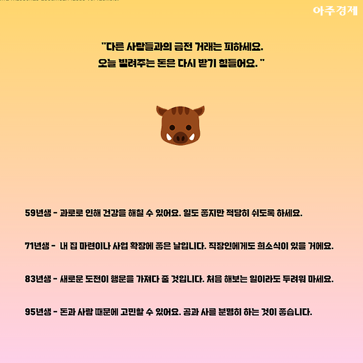 ▶돼지띠 오늘의 운세 "다른 사람들과의 금전 거래는 피하세요. 오늘 빌려주는 돈은 다시 받기 힘들어요. "