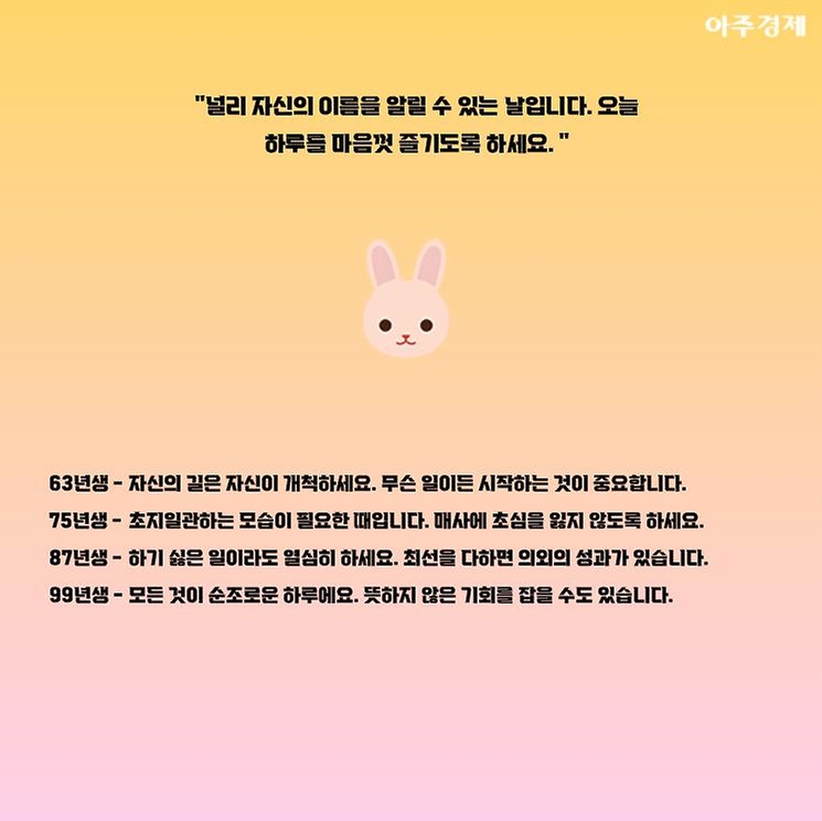 ▶토끼띠 오늘의 운세 "널리 자신의 이름을 알릴 수 있는 날입니다. 오늘 하루를 마음껏 즐기도록 하세요. "