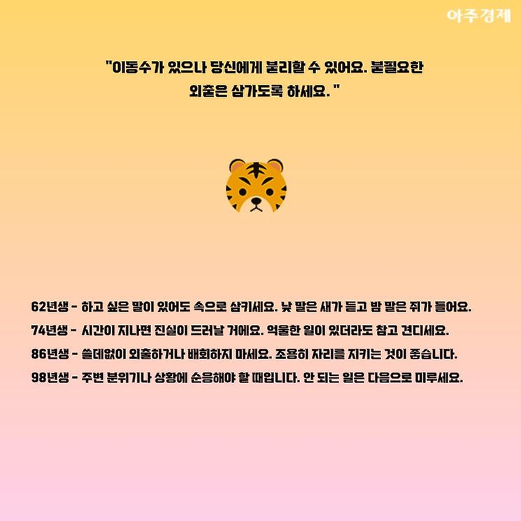 ▶호랑이띠 오늘의 운세 "이동수가 있으나 당신에게 불리할 수 있어요. 불필요한 외출은 삼가도록 하세요. "