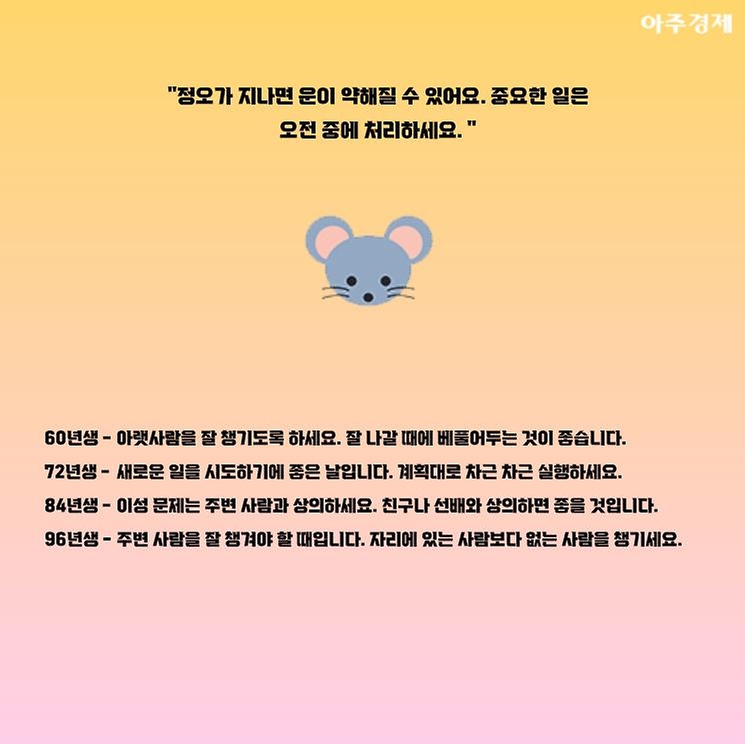 ▶쥐띠 오늘의 운세 "정오가 지나면 운이 약해질 수 있어요. 중요한 일은 오전 중에 처리하세요. "