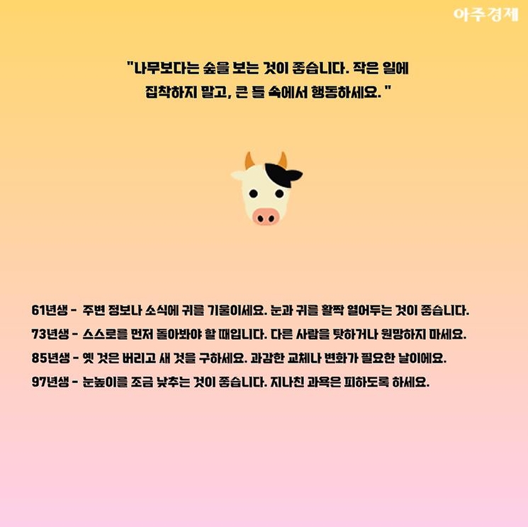 ▶소띠 오늘의 운세 "나무보다는 숲을 보는 것이 좋습니다. 작은 일에 집착하지 말고, 큰 틀 속에서 행동하세요. "