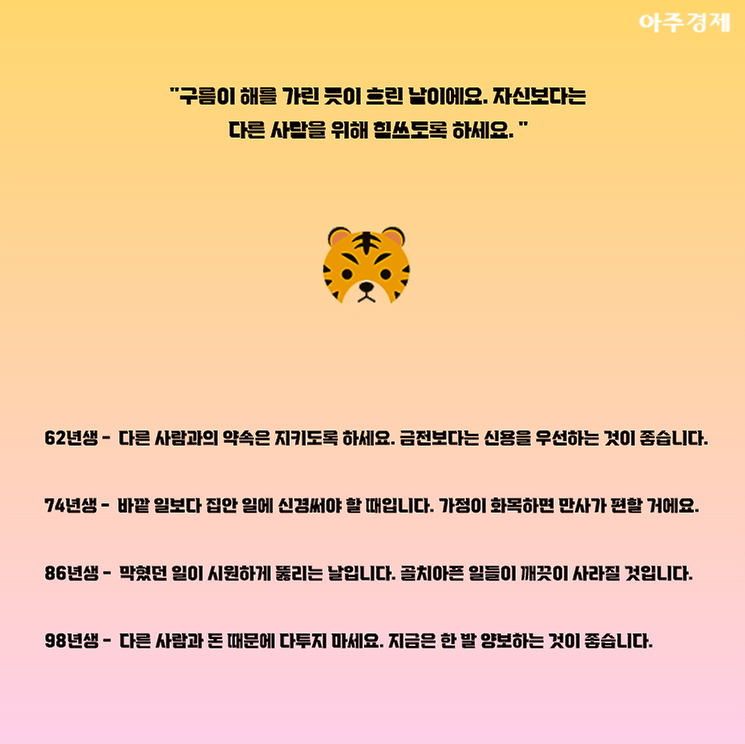 ▶호랑이띠 오늘의 운세 "구름이 해를 가린 듯이 흐린 날이에요. 자신보다는 다른 사람을 위해 힘쓰도록 하세요. "