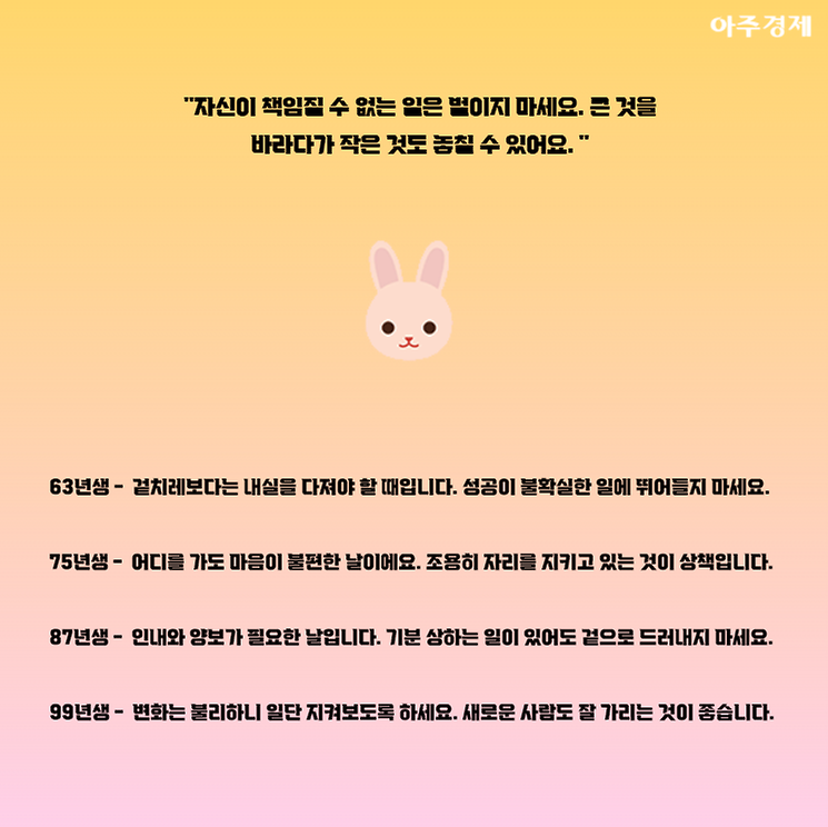 ▶토끼띠 오늘의 운세 "자신이 책임질 수 없는 일은 벌이지 마세요. 큰 것을 바라다가 작은 것도 놓칠 수 있어요. "
