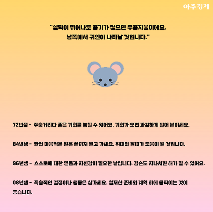 ▶쥐띠 오늘의 운세 "실력이 뛰어나도 용기가 없으면 무용지물이에요. 남쪽에서 귀인이 나타날 것입니다."