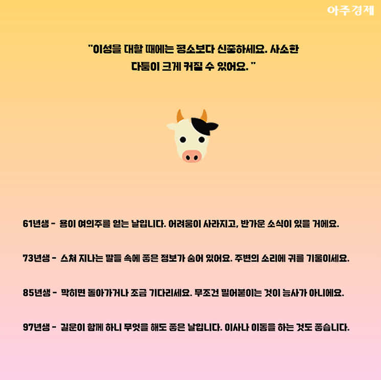 ▶소띠 오늘의 운세 "이성을 대할 때에는 평소보다 신중하세요. 사소한 다툼이 크게 커질 수 있어요. "
