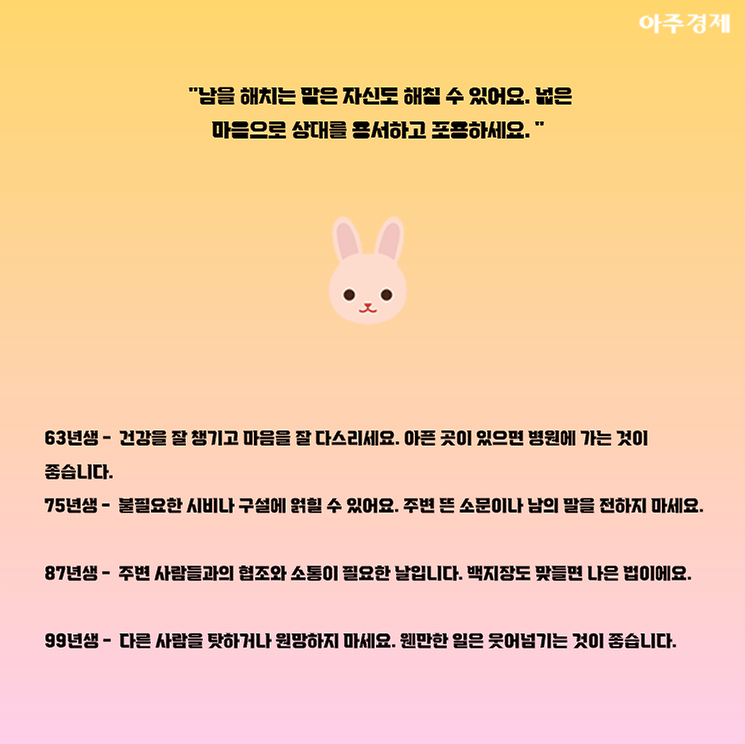 ▶토끼띠 오늘의 운세 "남을 해치는 말은 자신도 해칠 수 있어요. 넓은 마음으로 상대를 용서하고 포용하세요. "