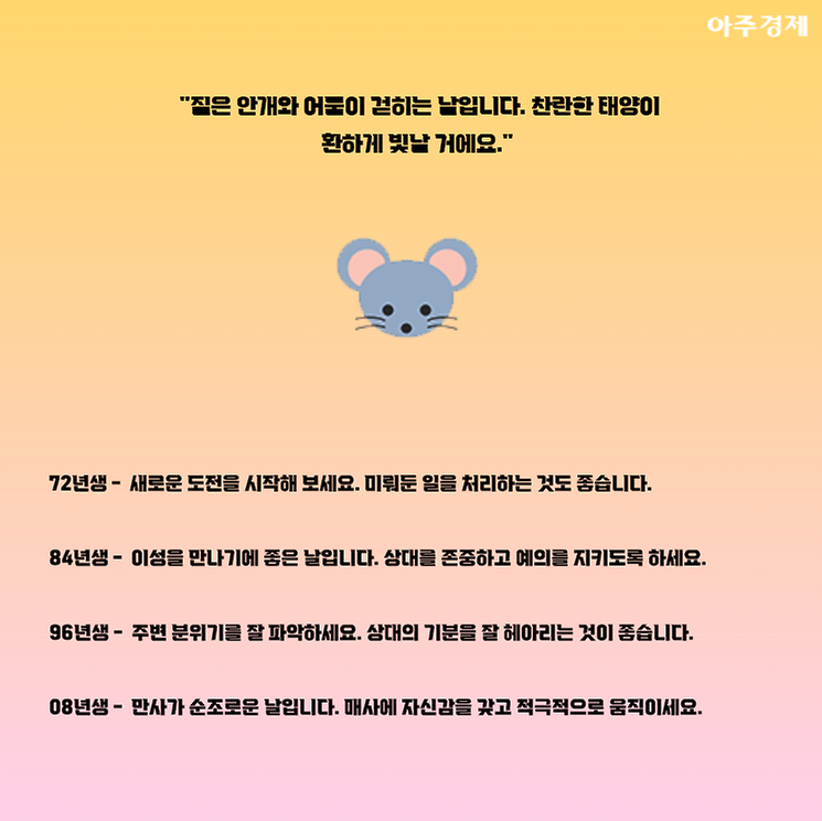 ▶쥐띠 오늘의 운세 "짙은 안개와 어둠이 걷히는 날입니다. 찬란한 태양이 환하게 빛날 거에요."