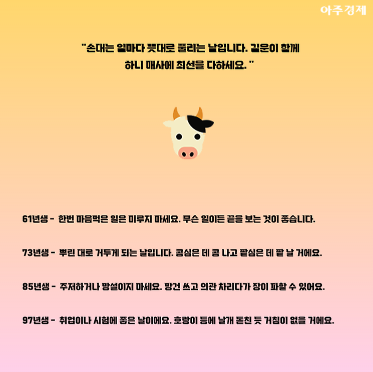 ▶소띠 오늘의 운세 "손대는 일마다 뜻대로 풀리는 날입니다. 길운이 함께 하니 매사에 최선을 다하세요. "