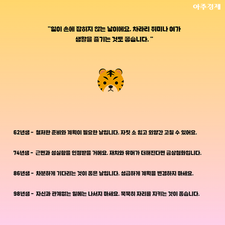 ▶호랑이띠 오늘의 운세 "일이 손에 잡히지 않는 날이에요. 차라리 취미나 여가 생활을 즐기는 것도 좋습니다. "