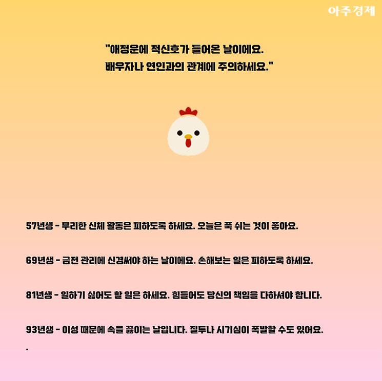 ▶닭띠 오늘의 운세  "애정운에 적신호가 들어온 날이에요. 배우자나 연인과의 관계에 주의하세요."