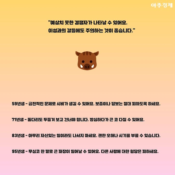 ▶돼지띠 오늘의 운세 "예상치 못한 경쟁자가 나타날 수 있어요. 이성과의 갈등에도 주의하는 것이 좋습니다."
