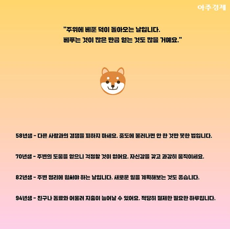 ▶개띠 오늘의 운세 "주위에 베푼 덕이 돌아오는 날입니다. 베푸는 것이 많은 만큼 얻는 것도 많을 거에요."