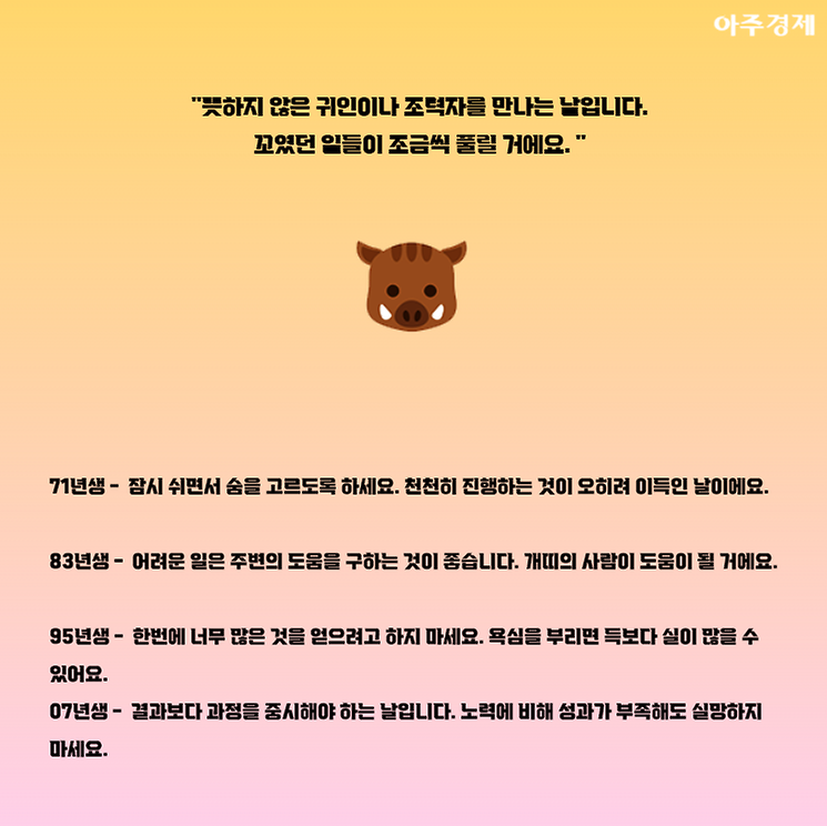 ▶돼지띠 오늘의 운세 "뜻하지 않은 귀인이나 조력자를 만나는 날입니다. 꼬였던 일들이 조금씩 풀릴 거에요. "