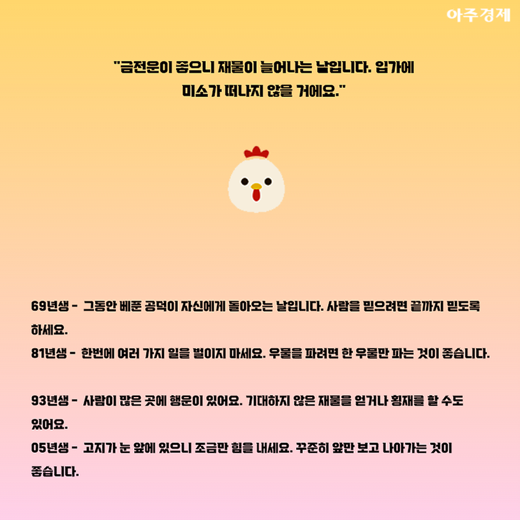 ▶닭띠 오늘의 운세 "금전운이 좋으니 재물이 늘어나는 날입니다. 입가에 미소가 떠나지 않을 거에요."