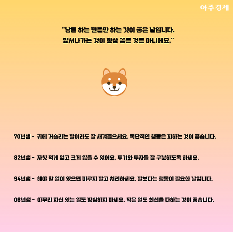 ▶개띠 오늘의 운세 "남들 하는 만큼만 하는 것이 좋은 날입니다. 앞서나가는 것이 항상 좋은 것은 아니에요."