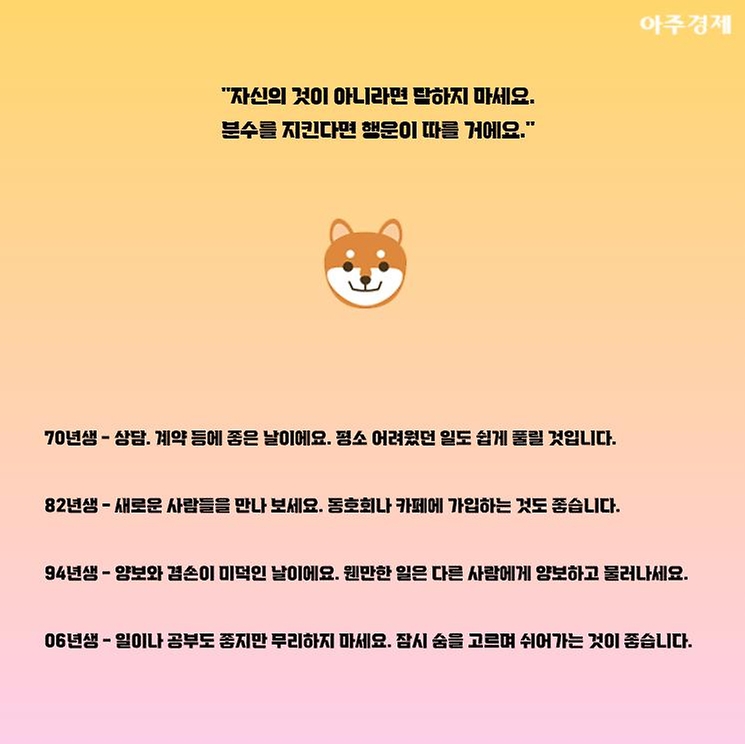 ▶개띠 오늘의 운세 "자신의 것이 아니라면 탐하지 마세요. 분수를 지킨다면 행운이 따를 거에요."