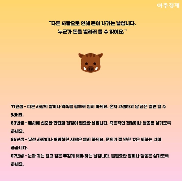 ▶돼지띠 오늘의 운세 "다른 사람으로 인해 돈이 나가는 날입니다. 누군가 돈을 빌리러 올 수 있어요."