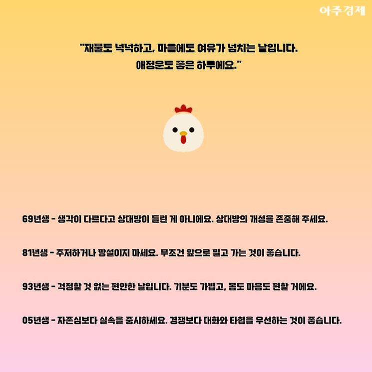▶닭띠 오늘의 운세 "재물도 넉넉하고, 마음에도 여유가 넘치는 날입니다. 애정운도 좋은 하루에요."